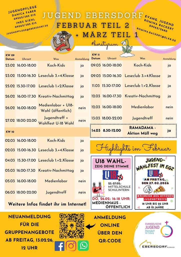Nach den Ferien geht es spannend weiter! Ein Termin folgt dem anderen. Wenn auch ihr nichts verpassen wollt, schaut doch mal auf unser Borstigram für Februar und März vorbei. Für unsere Angebote könnt ihr euch ab Freitag den 13. Februar ab 12 Uhr wie gewohnt auf unserer Seite: https://ebersdorf.feripro.de anmelden.