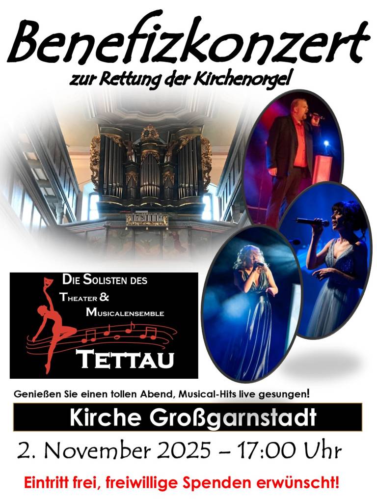 Am 2. November findet in der Kirche Großgarnstadt das Benefizkonzert mit den Solisten des Theater- und Musicalensembles Tettau statt.