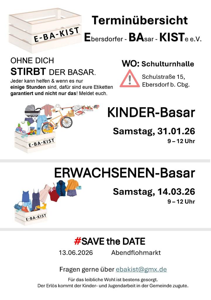 Die Ebersdorfer Basar-Kiste e.V. veranstaltet am Samstag, 31.01. - von 9 - 12 Uhr - in der Schulturnhalle wieder einen großen KINDER-Basar.