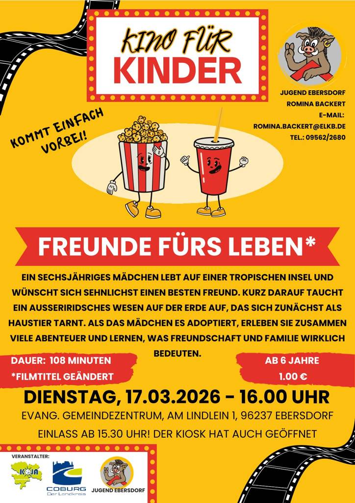 Nächste Woche Dienstag, also am 17.März, wartet das letzte Kino für Kinder in der Saison 2025/2026 auf euch! Kommt ins EGZ und seid bei dem Film "Freunde fürs Leben" dabei (Filmtitel geändert). Weitere Info's folgen.