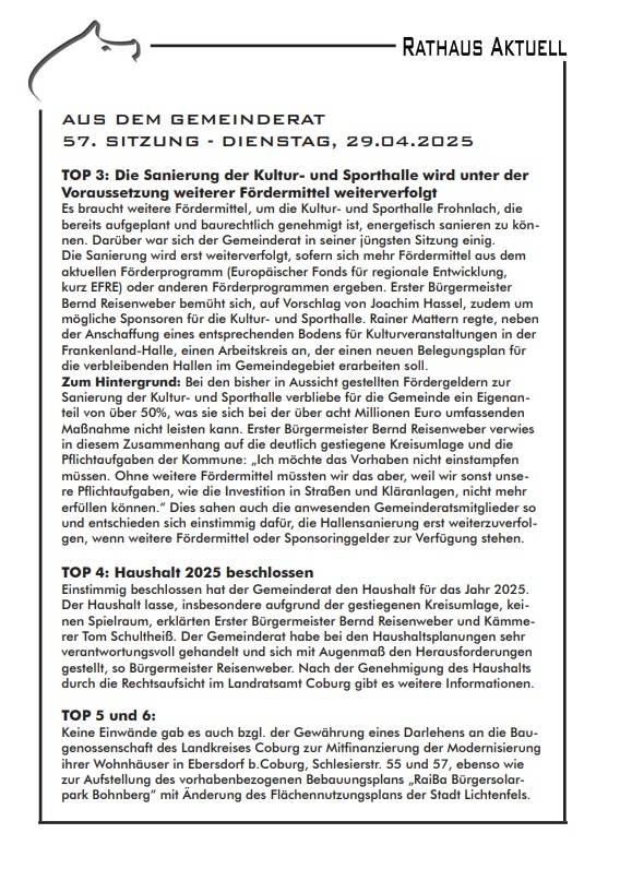 Wie bereits gestern in der Schnellmeldung mitgeteilt, hat der Gemeinderat die Sanierung der Kultur- und Sporthalle beschlossen. Hintergrund ist, dass die Regierung von Oberfranken höhere EFRE-Fördermittel als bisher zugesagt hat und sich der Eigenanteil der Gemeinde somit reduziert. Dadurch ist die Finanzierung der KSH nun doch möglich.