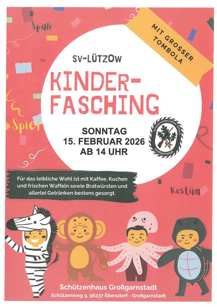 Es ergeht herzliche Einladung an alle großen und kleinen Kinder zum großen Kinderfasching im Schützenhaus nach Großgarnstadt zu kommen, am