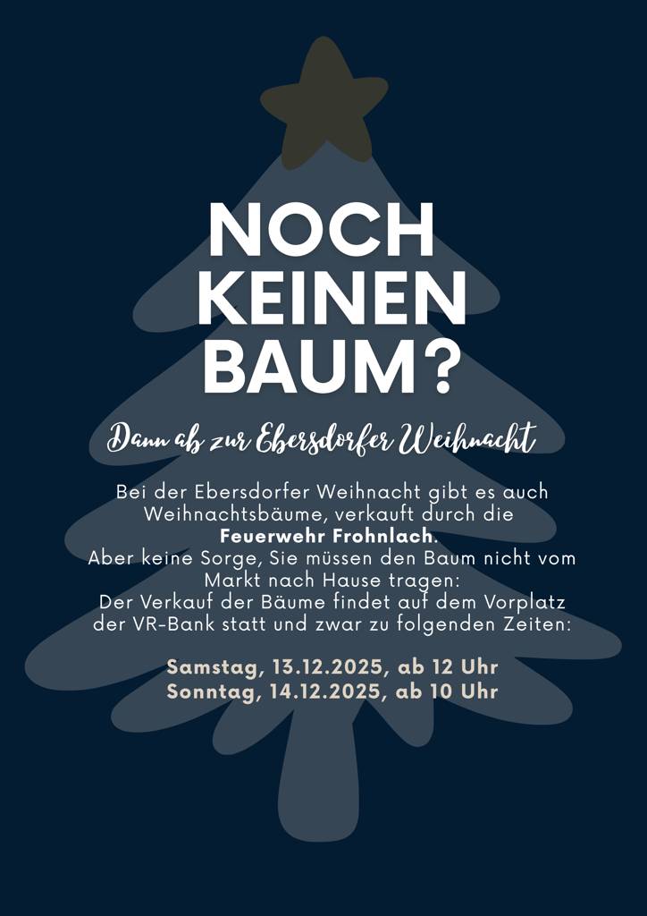 Keine Sorge, Sie müssen diesen nicht vom Markt tragen. Vielmehr verkauft die Feuerwehr Frohnlach die Bäume vor Beginn des Weihnachtsmarktes auf dem Parkplatz vor der VR-Bank, so dass Sie dort mit dem Auto hinfahren und den Baum aufladen können.
