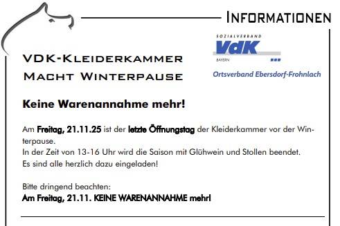 Die VDK-Kleiderkammer in Frohnlacher, Göritzenstraße 16 hat am Freitag, den 21. November zum letzten Mal vor der Winterpause geöffnet.