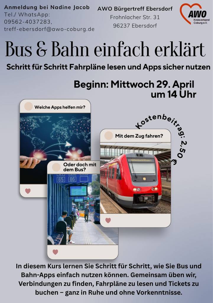 In diesem Kurs lernt man an drei Nachmittagen, wie man Schritt für Schritt, die verschiedenen Nahverkehrs-Apps nutzen kann. Gemeinsam üben wir Verbindungen zu finden, Fahrpläne zu lesen und Tickets zu buchen – ganz in Ruhe und ohne Vorkenntnisse.