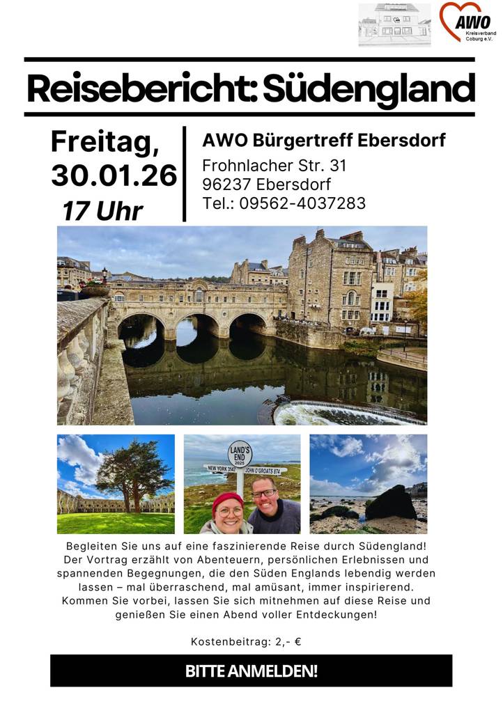 Im AWO Bürgertreff Ebersdorf, Frohnlacher Str. 31, seid ihr herzlich zu einem Reisebericht eingeladen.